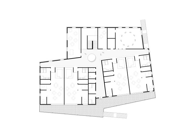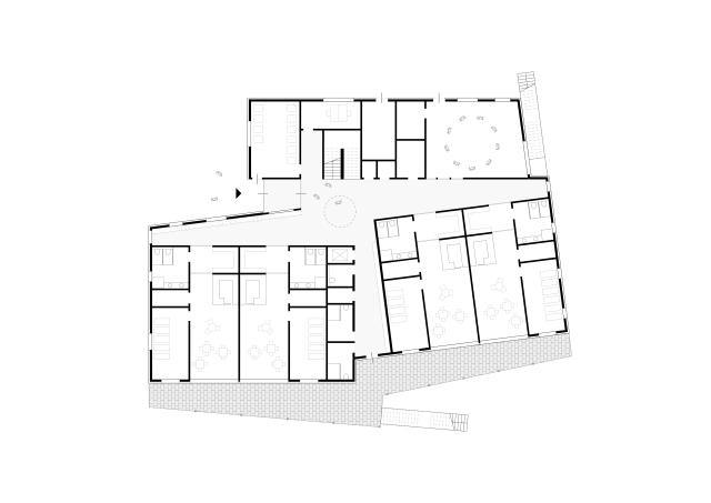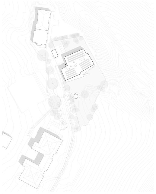Das neue Gebäude wurde am nördlichen Rand des Campus situiert und öffnet sich hin zur umgebenden Landschaft. Über den neu geschaffenen Fussweg erreicht man den geschützten Eingangsbereich, der als Schwellenraum zum Kindergarten dient. Von dort öffnet sich ein heller Erschließungsraum als Verteiler nach oben, hin zu den einzelnen Gruppenräumen. Die einfache, klare Organisation erleichtert die Orientierung und schafft Übersicht und Offenheit. Durch eigene Vorbereiche und Garderoben gelangt man in die Gruppenräume. Der Ruheraum bildet als Rückzugsort einen wichtigen Teil der Kinderwelt und kann bei Bedarf zum Gruppenraum hin geöffnet werden. Großzügig öffenbare Fensterflächen und die vorgelagerte überdachte Terrassenfläche, erweitern den Raum ins Freie und ermöglichen einen unkomplizierten Wechsel zwischen drinnen und draußen.